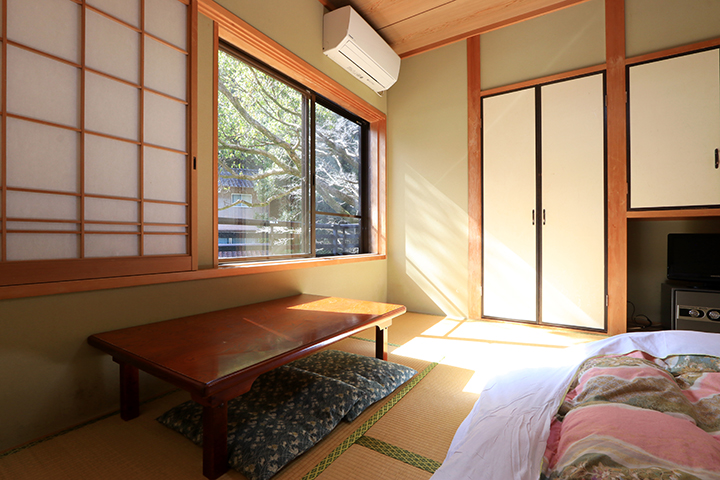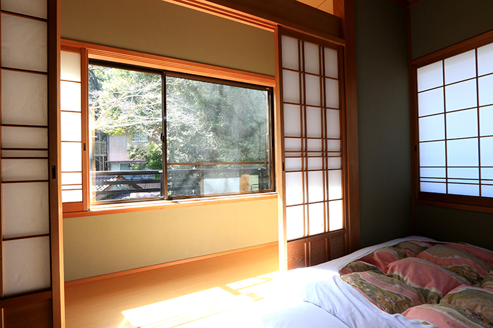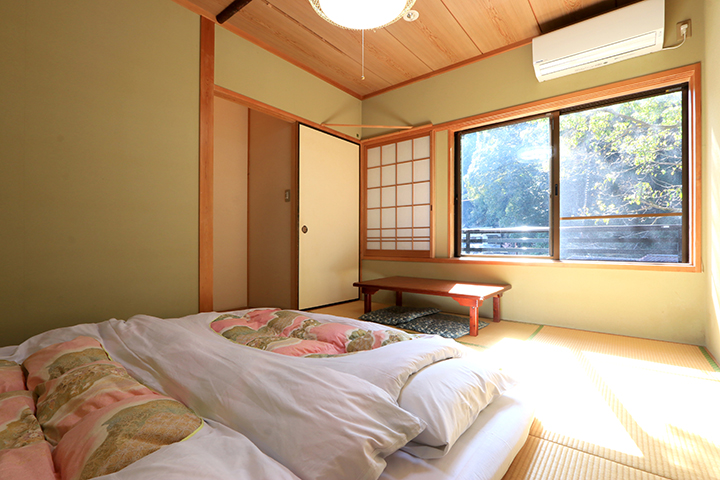 客室は全9室の純和室。リニューアルをして綺麗にはなりましたが、昔からの風情は残したままです。窓を覗くと昔から変わる事のない景色四季を通じておもてなす。 流れる川のせせらぎと木々を揺らす風の声を聞きながら、ひと時の安らぎをご堪能下さい。
